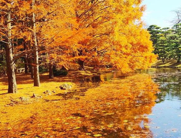 色づく針葉樹・・・・というのがいいじゃありませんか。池には鯉がのんびり群れて人の気配をむしろ喜んで親しげに近づいてくるんですね。
