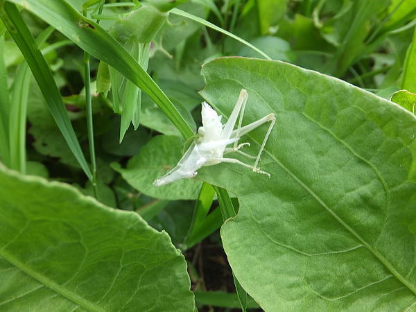 へーっ・・・・。バッタの抜け殻って、白くて素敵なスケルトンなんですねえ・・・・。まあ、なんとも上手に抜け出したようであります。