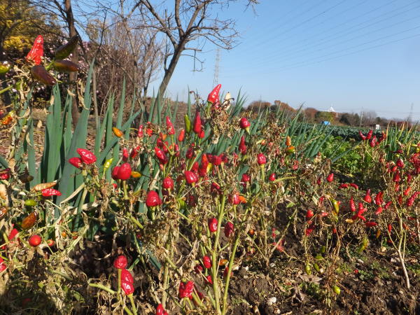 なぜか、畑に炎のように点在する唐辛子がこの寒空に似合っていたのです。唐辛子といえば、内部からポカポカになるイメージもありまして、ピピピ・・・と、締まった気分にもなり、足の先が温まってくるような気分になりましたね。