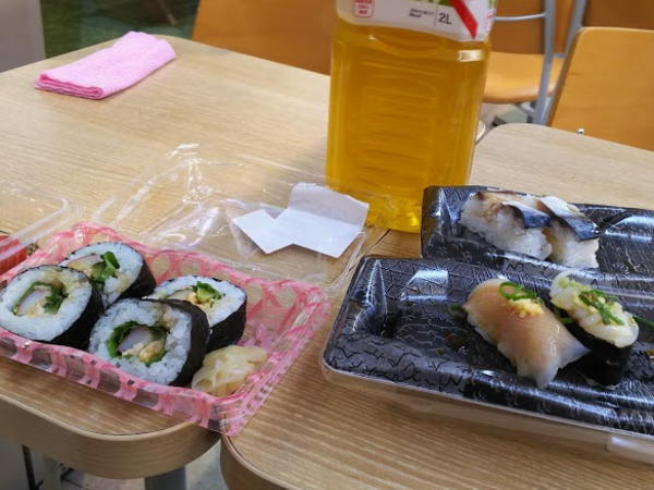 これは、コンビニでないところが味噌であります。安くて新鮮な食材を購入して、人気のないテーブルでいただきます。このごろは、刺身なんぞも食べてしまう。自宅に帰れない時などに素敵です。