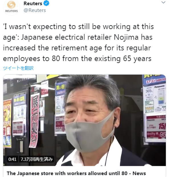「"この歳まで働こうとは思っていませんでした"日本の電気販売店ノジマが定年退職を現行の65歳から80歳に引き上げ」