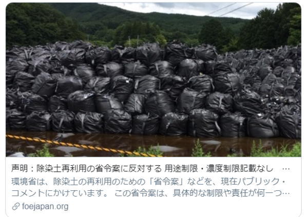 環境省は、除染土の再利用のための「省令案」を、現在パブリック・コメントにかけています。この省令案は、具体的な制限や責任が何一つもりこまれていません。このままでは除染土が住民の知らない間に再利用されて、もその責任をだれも負わないということにも。