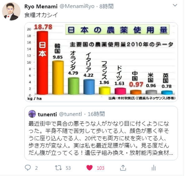 最近街中で具合の悪そうな人がかなり目に付くようになった。半身不随で苦労して歩いてる人、顔色が悪く辛そうに座り込んでる人、20代でも両方に杖を突いてる人、歩き方が変な人。実は私も最近足腰が痛い。見る度だんだん腹が立ってくる!遺伝子組み換え・放射能汚染食材ばかりだからだ!